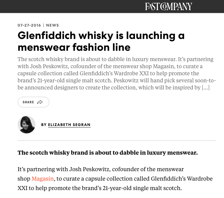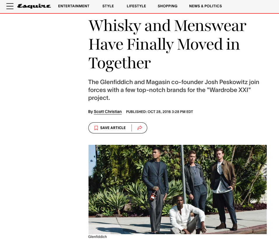 Tasked with integrating Glenfiddich into the world of alternative, high-end menswear, Luca helped write and develop a lifestyle program and video content series for the brand’s 21-year-old variant, Glenfiddich XXI, seamlessly positioning the liquid into the cultural milieu of its target consumer with a defined cultural identity around fashion. This included a hyper-exclusive luxury menswear capsule collection entitled “Wardrobe XXI”, curated by fashion veteran Josh Peskowitz, in close collaboration with Camoshita United Arrows, E. Tautz, Hamilton, and FEIT. It translated across a short film and proprietary thought leadership website featuring original content. It came to life IRL across multiple retail touchpoints, with event programming at Gentry, Magasin, Forty Five Ten, MEYVN and Alchemist.